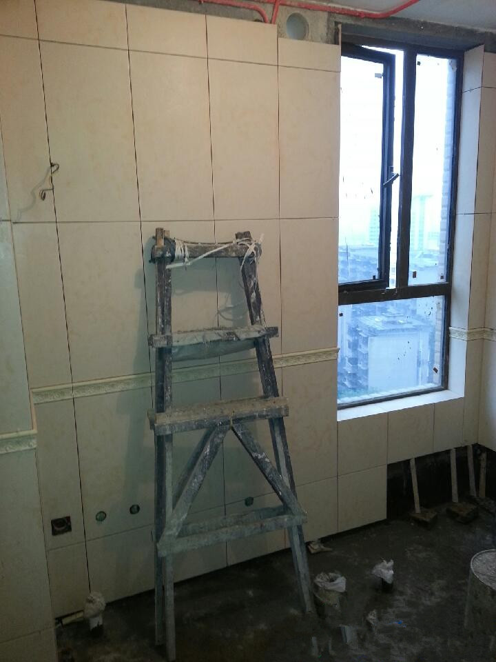 厨房刚刚贴好墙面,由于手机和天气的原因,拍出来效果一般,但能看个大概了,师傅说填上填缝剂效果更好(据说实物看起来平整多了),我很期待。厨房是罗马利奥210*210的规格,用了8袋瓷砖胶,师傅说好费力贴了三天。