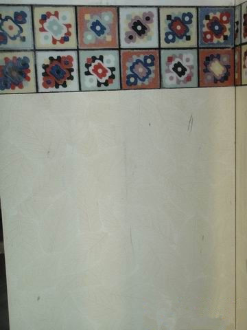 我家阳台墙砖是两种不同花色、风格的釉面砖,用一圈山寨腰线做了分隔,效果也还说的过去,腰线以下是枫叶图案的,上面是仿壁纸条纹墙砖。我折腾出的混搭腰线,和枫叶图案的釉面砖: