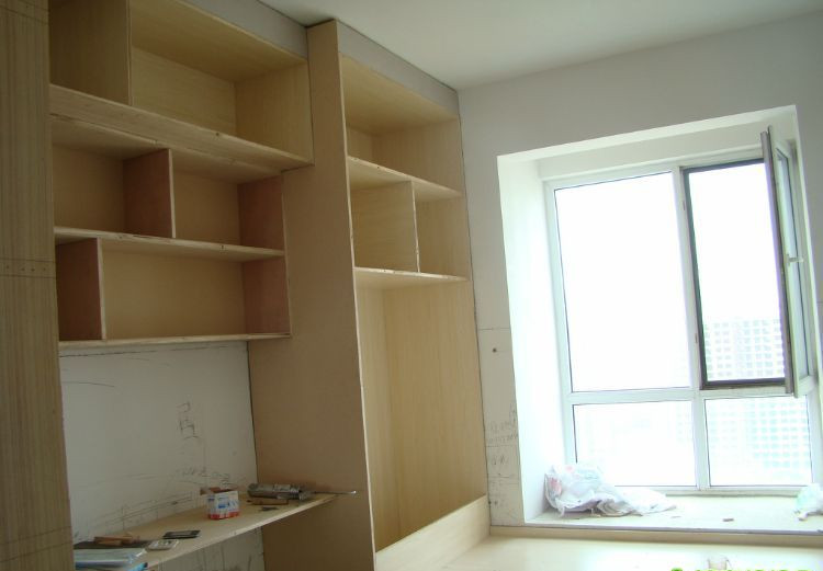 从书房门口看榻榻米和电脑桌,书架以及上方橱子。未上漆前得榻榻...