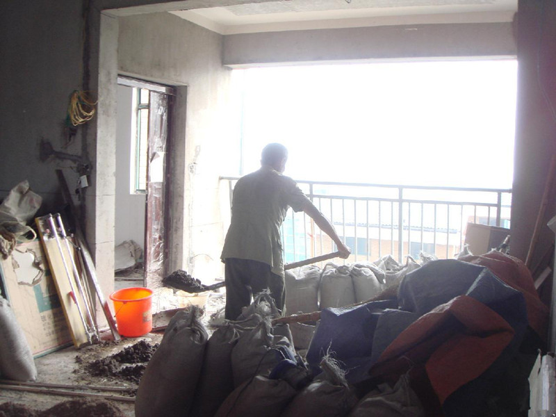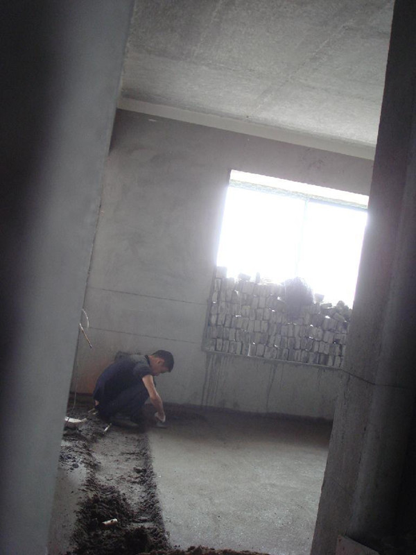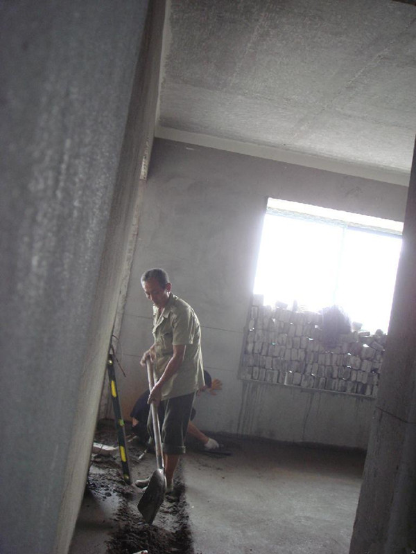 毛师傅终于来了,同时还带了一个助手黄伯,专门为他打下手!由于我运沙子请的不是专业人员,沙子全部放在客厅中间影响施工,毛师傅只好先将铺木地板的三个房间找平,待房间干后,再将部份沙子移动到房间,只好辛苦黄伯了!移了沙子,还得移动地砖!