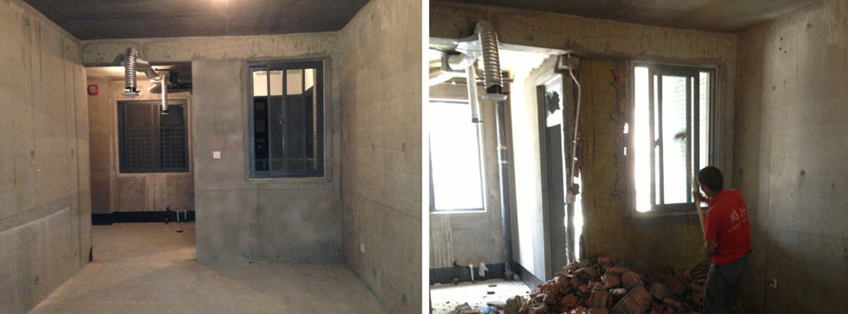 打掉厨房和洗衣机的间隔并两间为一间 在这要说下师傅做活的问题,这两位师傅拆除窗户和推拉门的时候,都是直接把玻璃砸碎,然后强行拆除窗框和门框。