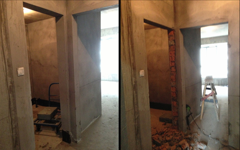 客卫的门洞太窄,考虑到家里有老人坐轮椅进出不便,所以砸掉了一些门框,扩大门洞。
