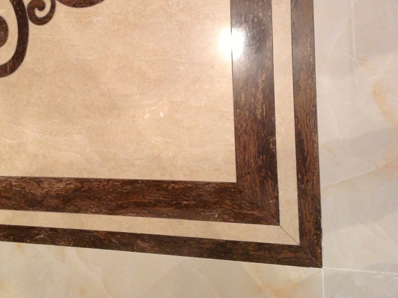我家玄关拼花中间的图案是瓷砖厂家做好的,周围两圈波打线也是裁成了一条一条送来的,但是厂家没有把波打线切45度角。