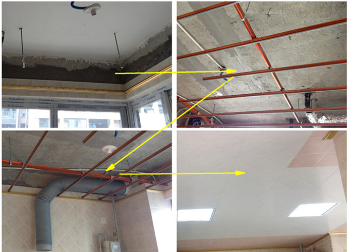 安装步骤是:粘扣边——在屋顶订钢筋——挂龙骨——装烟管——装面板及电器,打胶;再来看看梁的处理,我家厨房中间横着一道梁,我们把它包在里面了。
