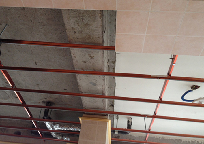 齐家网> 齐家装修论坛> 装修> 安装步骤是:粘扣边——在屋顶订钢筋——挂龙骨——装烟管——装...