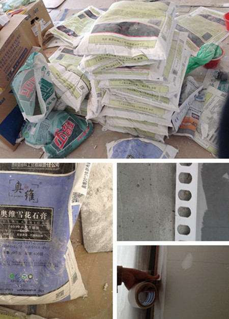 小何是包工包料的,我只要选好品牌材料,其他的就统统不用管了。我选的就是当地的奥维耐水腻子,个人感觉足够了,物美价廉。其他辅料还包括白水泥、界面剂...上个图让它们露个脸吧(没拍全)。