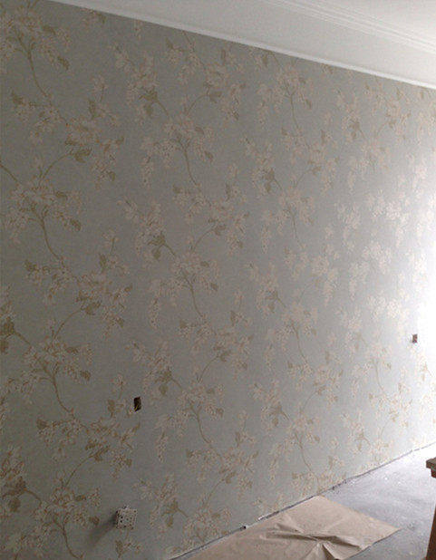 次卧的色调选择了做旧的蓝色, 用的欧堡的进口纸基壁纸,这款贴出来很耐看,在光线下若隐若现的银色网格很大气小奢华,床头墙的大花也很典雅。