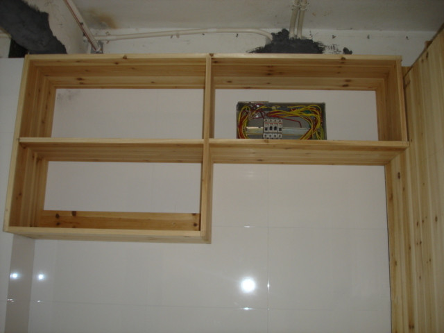 洗衣房吊柜,右边这扇门,如果做两个对开门好像太小。汪师傅想改成上开的。