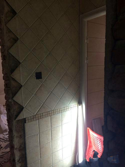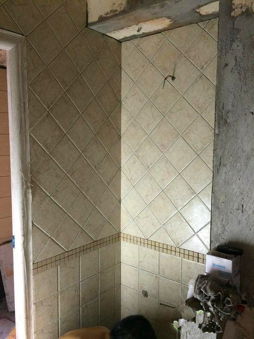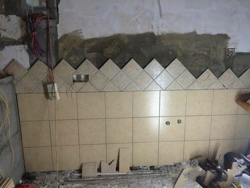 八点半,师傅们已经早早开工了,还是两个师傅在贴砖,一个在贴外置洗手盆间,一个在贴餐厅西厨的墙壁啦!我心仪的小方砖已经上墙啦!再次赞下师傅贴砖的手工,美啊!拍了两张,大家看下,美式乡村的感觉出来了,有没有啊?期待完工的图片!