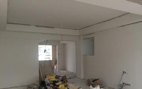 看看图片吧,这是客厅,腻子已经很厚了,厅中间的百得腻子粉也只剩下10包左右了,看到右边电视墙上的窗洞没?那个是为了给琴房取光用的,计划用铁艺加玻璃封起来,蔡工在帮我找材料。