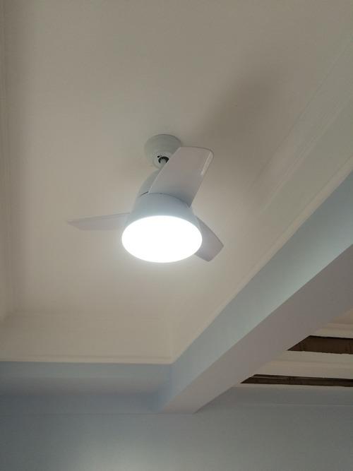 最后出场的是非常可爱的一个小吊扇灯,装在主卧榻榻米上方的,因为主卧狭长,一个吊扇估计不到这边,书桌和榻榻米在这里,装个吊扇灯还是很有必要的,这款自带光源,亮度也足够。