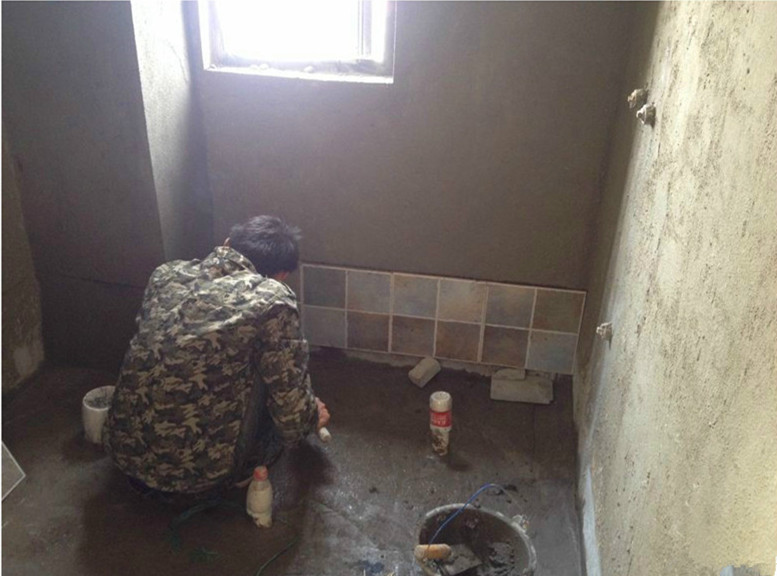 齐家网> 齐家装修论坛> 装修> 工人在铺贴洗手间的瓷砖。