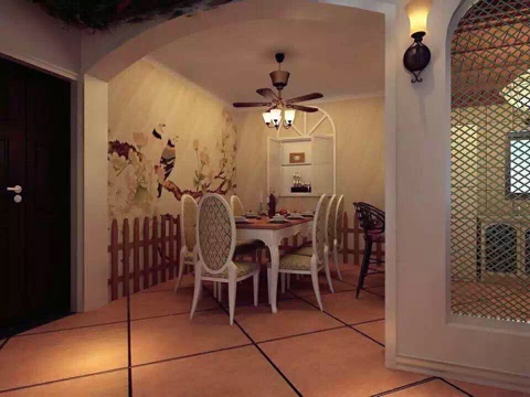 这是一入户看到的餐厅厨房以及过道,给客户做了个开放式的厨房,餐厅和厨房的区域是用吧台和酒柜区分的。厨房吊顶区分以往的集成吊顶,采用深色的木条阶梯式排列,餐厅做了一个篱笆墙,跟厨房的吊顶呼应,厨房的灯以及餐厅带吊扇的灯都是最质朴的铁艺灯。餐厅的北面做了一个能放小的装饰品的百叶门的假窗户,使得餐厅在视觉上开阔一些。而餐厅的壁画也选择比较自然质朴的话,跟篱笆墙的搭配显得栩栩如生,使整个空间灵动了起来。厨房与过道用麻绳做的窗户,女主人在厨房烹饪时男主人在客厅都可以看的到,想象一下都是很美的。