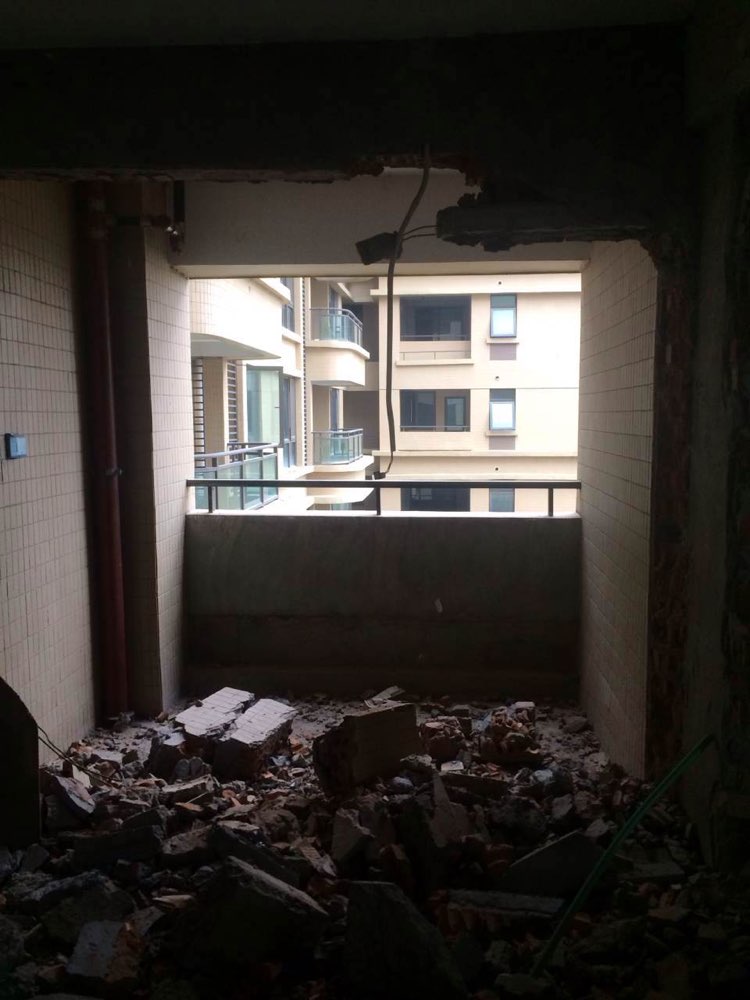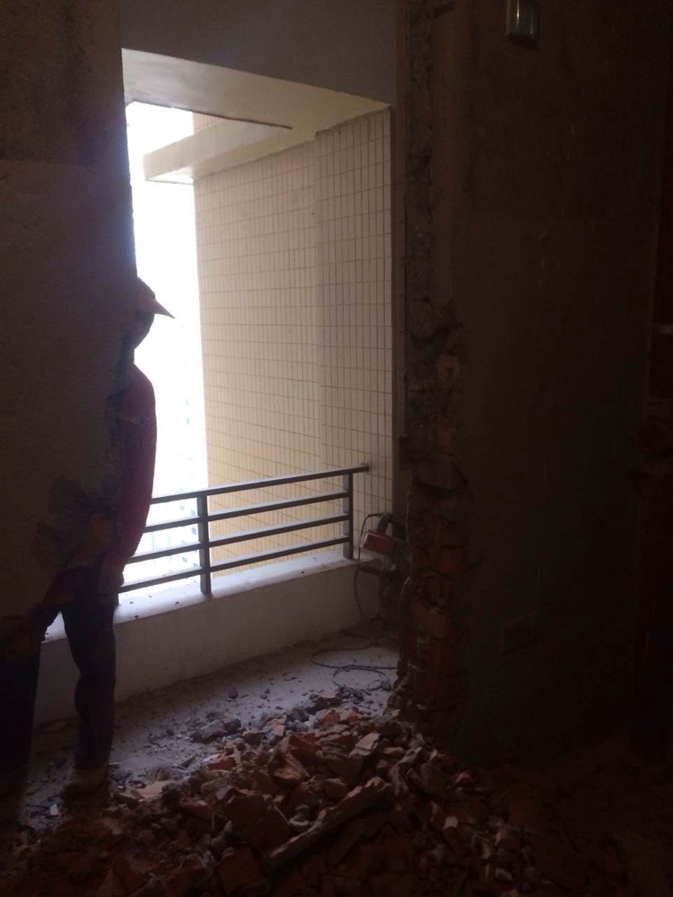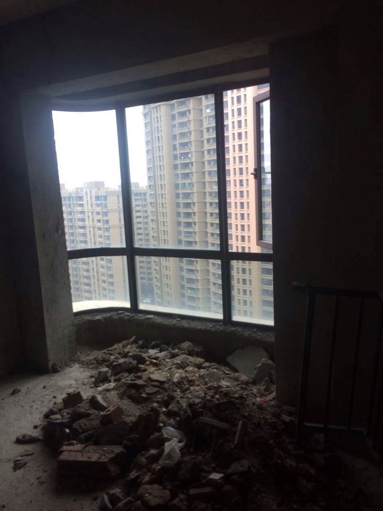 2015年底开始装修拆墙了,包给小区内部卖沙土的人,图个以后什么垃圾和材料到都不用自己搬到楼上,真真是有钱做什么都方便快捷,最后一张是飘窗敲掉的本来不想敲?想做飘窗设计,后来怕房间太小所以两个房间都敲掉不要,奶奶的一敲这个里面都是工业垃圾!臭的味道受不了,心里那个庆幸的?