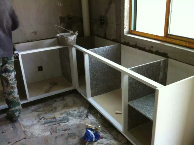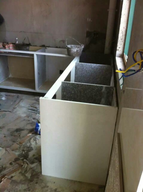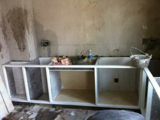 我家泥工快完工了,这些天一直没发,一是上班太忙,二是手机也出现问题拿去维修了。我家的砖都是我公公从市里带回来的,我公公在市里做这行,对砖比较了解,说好的让我去选花色,结果他直接就带回来了,不过我觉得公公眼光还不错,贴在墙上地上都还挺漂亮,而且都是名牌砖,质量特好。等泥工完事了,卫生打扫完,拍几张成品照上传。唉,泥工做事的过程中,才知道电工做事图省事,很粗糙,现在泥工都快完事了,悔之晚矣!这是昨天做的厨房地柜。