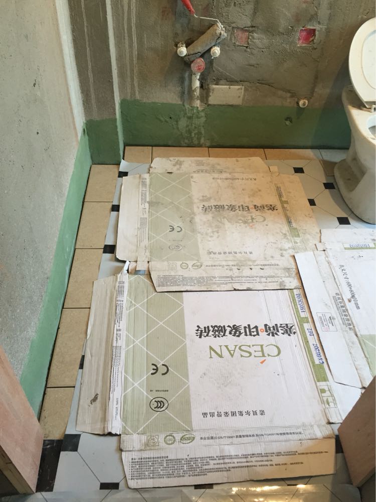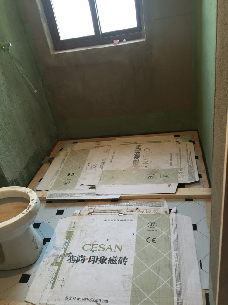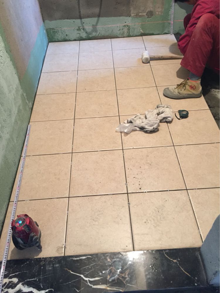 20160323-20160326休工四天,20160327开始继续贴砖,20160328早上看到两个卫生间地砖已经贴得差不多了。