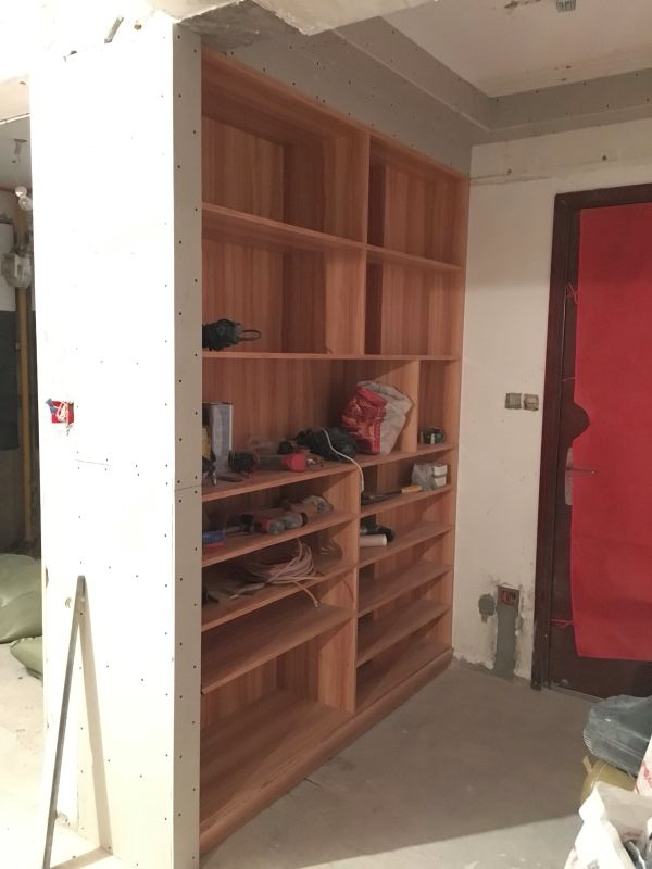 木工开始在家里现场制作橱柜和吊顶。因为不喜欢复杂的装修,吊顶及其简单,只是为了装几个射灯。