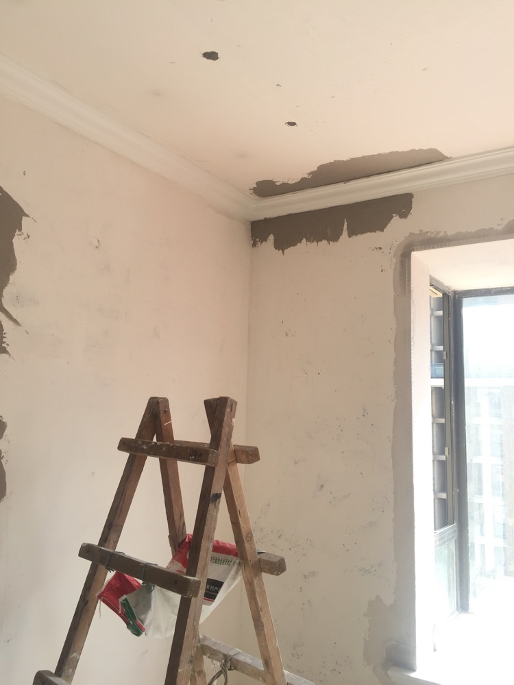 泥瓦工师傅做墙面时,木工师傅也在同步吊顶。因为家里层高有限,吊顶不适合面积做的太大,薄薄的走一圈划分空间就好。