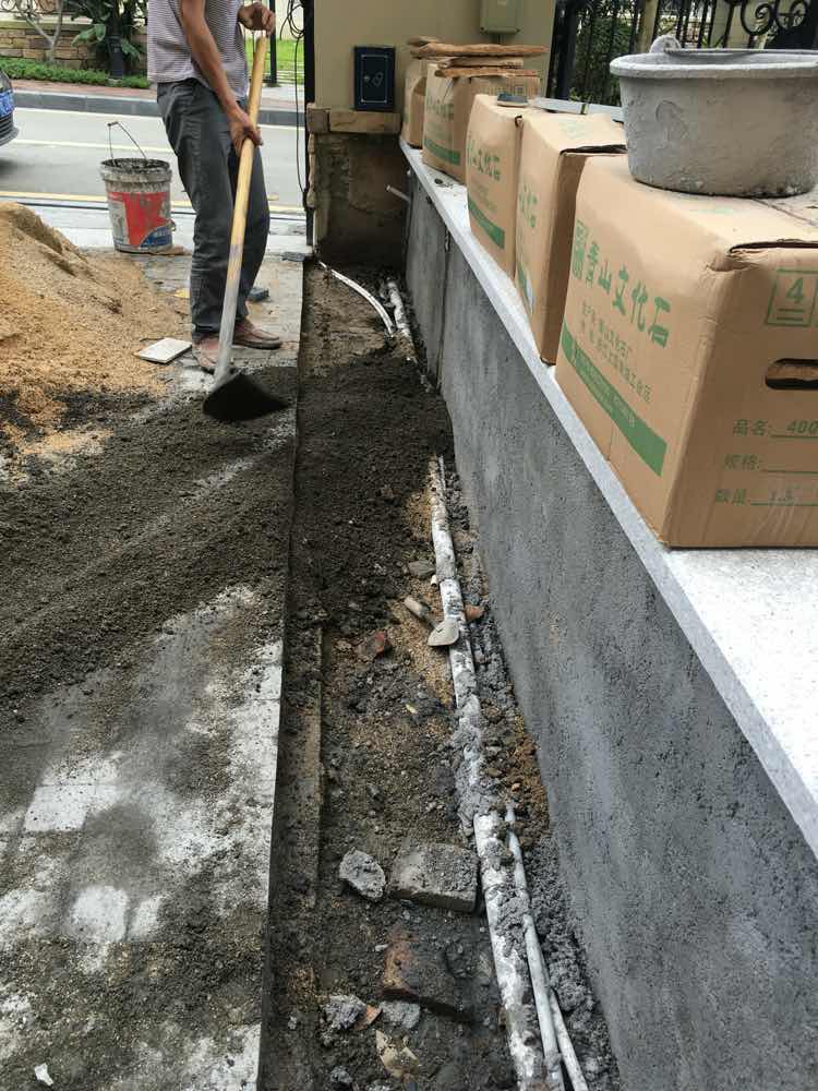 今天泥水师傅回来了,清理共有围墙下面的垃圾,固定电线管及底盒,安装花池两边的石头,我开打台阶脚灯的孔。下午来水泥15包,提文化石235元运费,防水接头10元,44大水钻头45元
