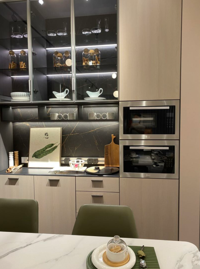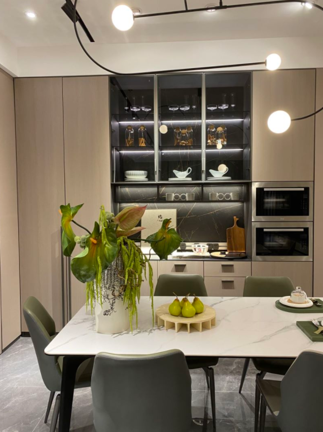 中间采用了典雅黑搭配金色纹路点缀的岩板作为主体框架,在加上银色金属框边的透明玻璃,在餐厅灯光的照耀下熠熠生辉,极大地提升了餐厅空间的格调与高级感。此外,这款餐边柜设计成了到顶式的结构,并且将每个收纳区块都进行了合理划分,不仅保障了收纳空间充足,还为用户收纳工作提供了有序引导,帮助收获更简洁的餐厅家居空间。