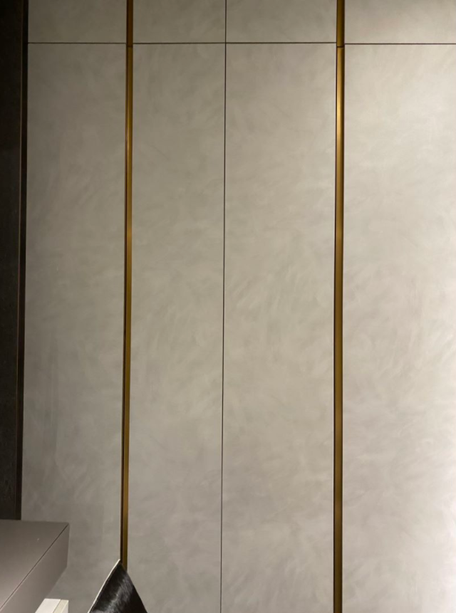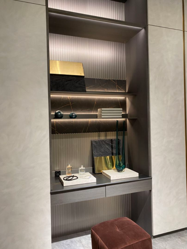 这款卧室衣柜采用了水痕纹的灰白封闭门板,再加上金色金属的内嵌式长直把手点缀,整体显得特别具有一致性,大气美观。