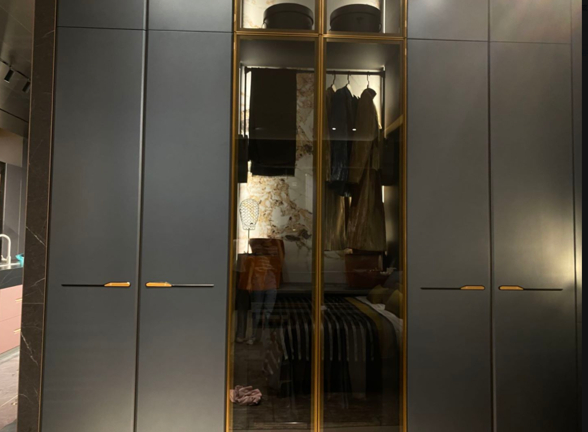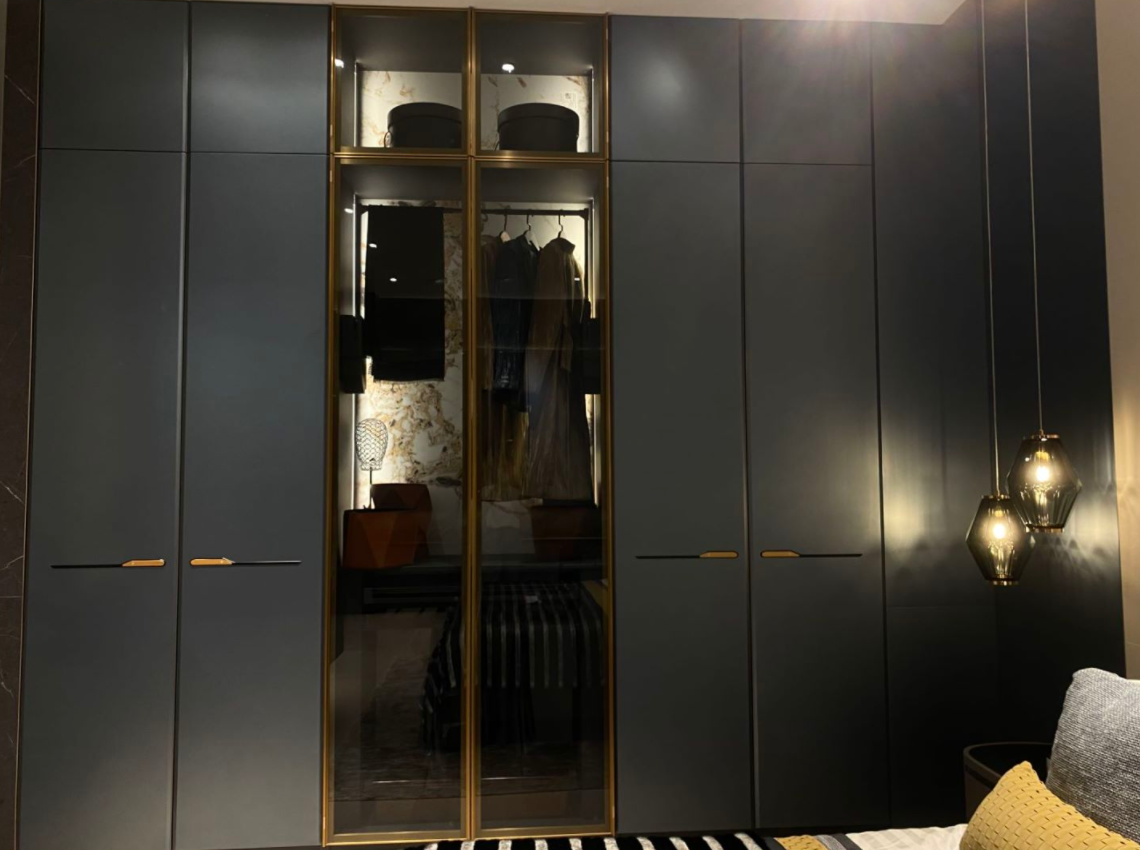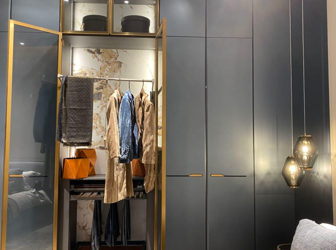这款衣柜采用了磨砂黑的金属门板作为主体设计,并在其间加入了金色金属框边的对开式透明玻璃柜,一暗一明、一实一虚,在衣柜低调沉稳的基础格调之中又融入了家居空间的生机感与设计感。
