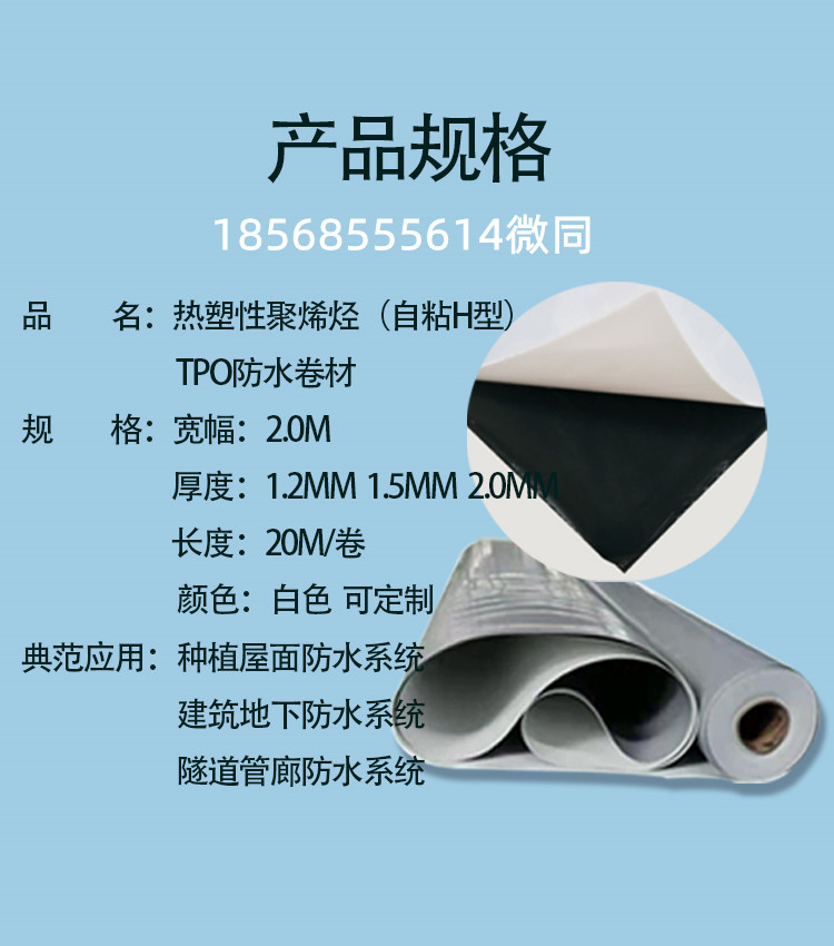 具备了TPO卷材和自粘卷材的诸多优点,下面是通用型TPO自粘复合防水卷材的典型特点:1、该产品的TPO卷材层与自粘卷材层各自具备独立防水能力,实现一次施工,两道防水。2、 TPO自粘复合防水卷材既具备TPO卷材高强度、耐老化、可焊接的优点,又具备了橡胶沥青自粘卷材的高延伸、自愈性及蠕变性。3、专利的高分子片材与沥青自粘粘接技术,解决了两层之间易分离、不相容、易起鼓的世界性难题。4、专利技术的隔离膜设计,解决了高温下不好揭膜的普遍性难题。优异的不窜水性:将防水层同结构层粘接,杜绝水流在卷材与混凝土之间流窜。5、根据工程情况不同可采用干铺法、湿铺法等工法,施工工法多样。 单面TPO自粘复合防水卷材施工时,采用专利技术“卯榫式”搭接,TPO卷材之间用热风焊接,自粘卷材之间冷粘,达到各自闭合的效果。6、产品具有优异的耐低温性能和耐候性能,并具备高延伸性:能有效抵抗10mm以内的建筑开裂变形,而防水层不被破坏。7、产品白色表面,起到反射阳光的作用,日光反射率可达80%以上,高于“美国能源之星”要求(能源之星标准为65%),可有效减轻城市热岛效应的不良影响。