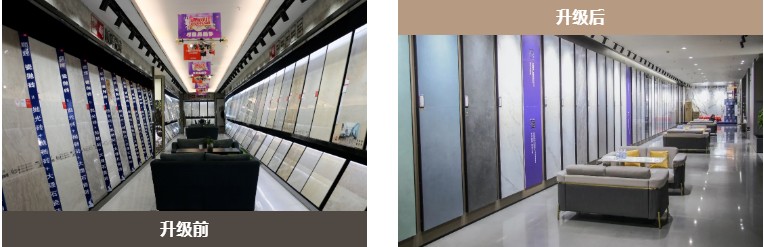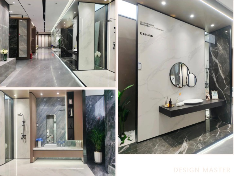 专卖店出入口产品展示和空间应用搭配上,以色系相近、风格相搭的产品进行系统化展示,到顶的直板形式也让大规格岩板更直观地呈现在消费者眼前,细腻的产品质感,触手可及。