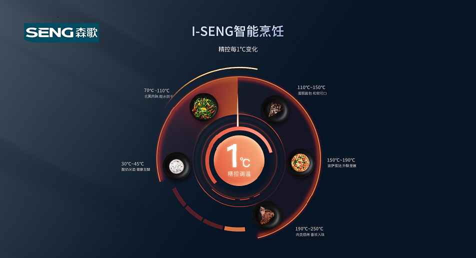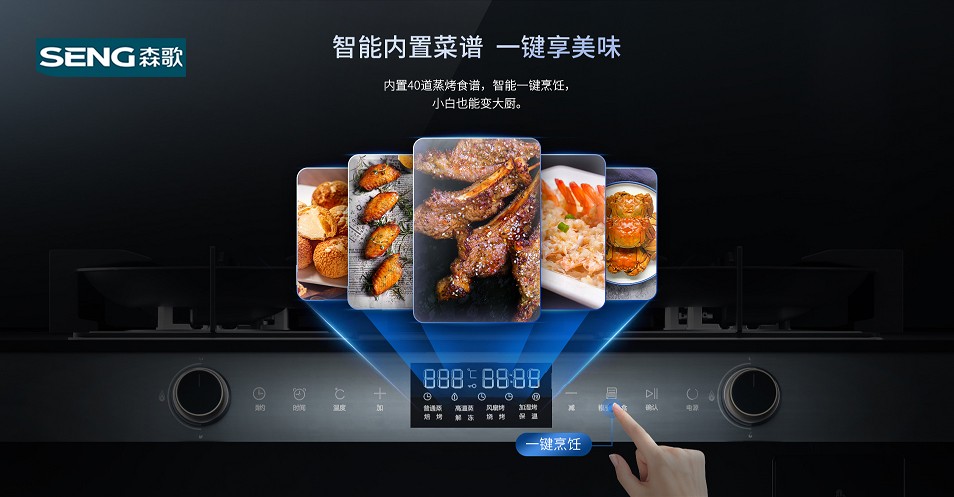 智能烹饪系统能精控每1℃变化, 30℃-200℃温域,让蒸得食物更鲜美,烤制出来的食物更可口。还搭载森歌创新开发的i-SENG智能烹饪系统,挥手智控搭载全新手感智控技术,“开机 小风 大风 关机”动动手就搞定,全程无触摸,内设40道专业菜谱能一键烹饪,厨艺不佳怕什么,让它来教你变身大厨。