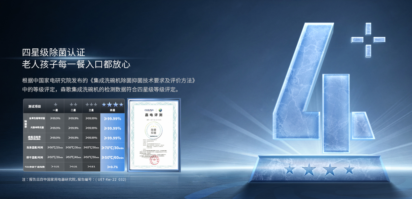 四重除菌系统,有效抑制病菌森歌集成U5除菌集成洗碗机“洗烘消存”4重除菌系统,分别为:洗:75°C高温冲洗强力除菌;烘:70°C PTC热风真烘干、消:UV紫外线巡航深度抑菌、存:72h新风鲜存长效抑菌,洗烘消存一气呵成。