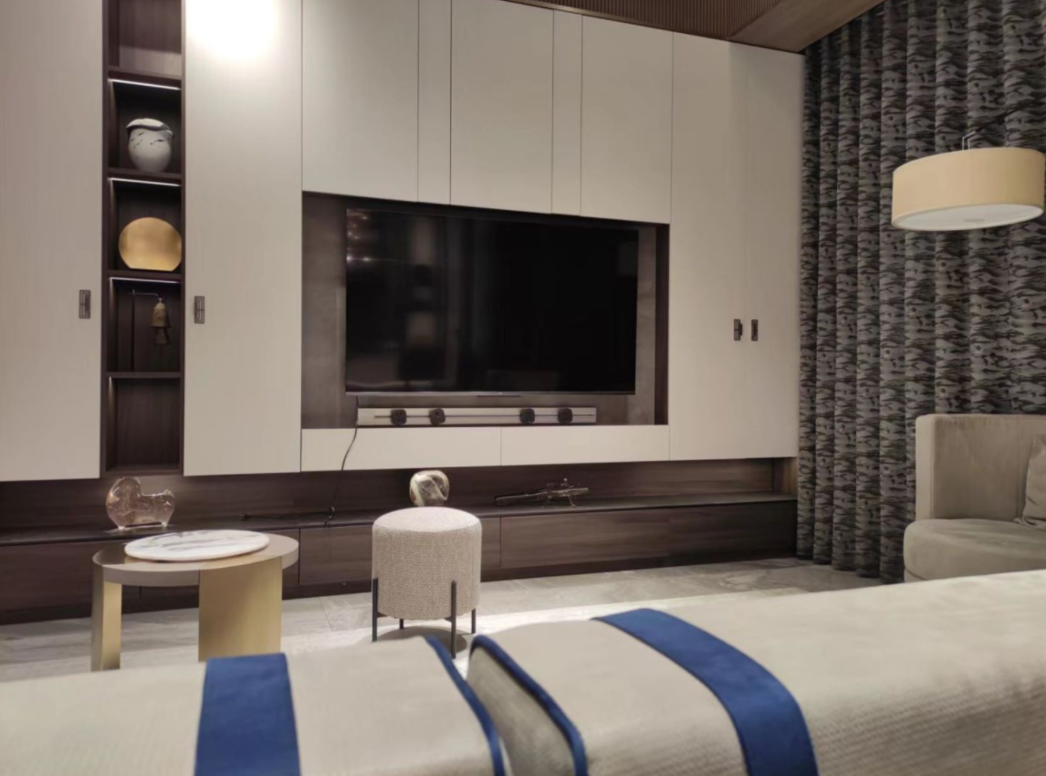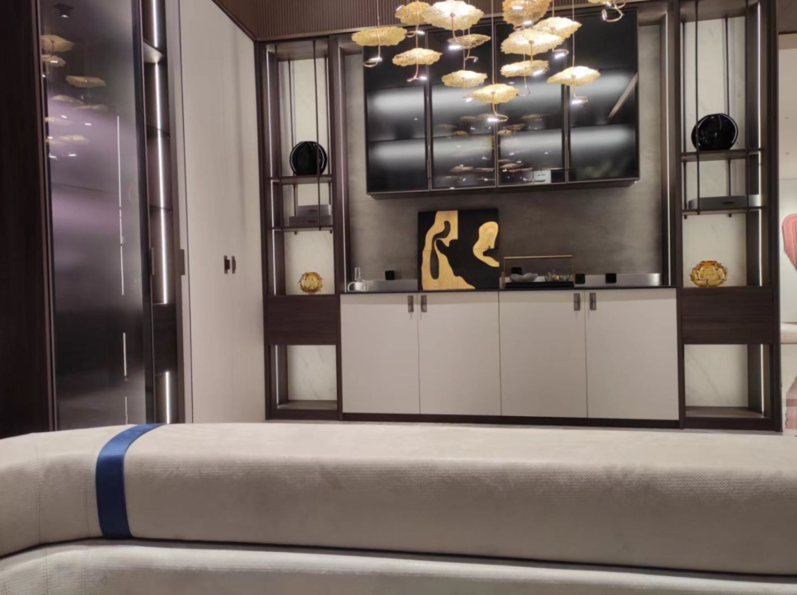 整体空间虽融为了同一整体,但还保留着各具特色的设计让整体空间更富多样性。电视柜采用大面积的香榭白门板搭配原木棕色的格柜框架,大气美观的设计提升了整个空间的高级格调。餐边柜则是多用开放柜格布局,并且还精心设计有磨砂玻璃壁龛,简约精致的设计带来了轻奢的空间氛围感。茶室空间则是融入了更多中国传统元素,以红白作为主色调的整体空间显得庄严庄重,富于古色古香的典雅韵味。