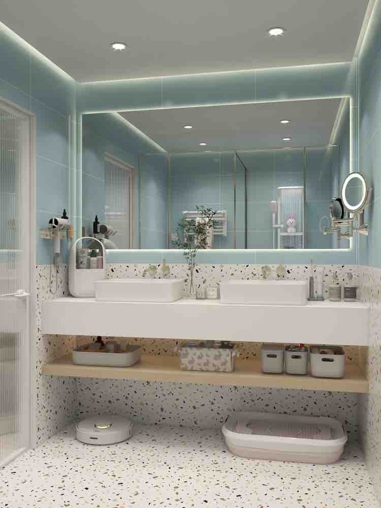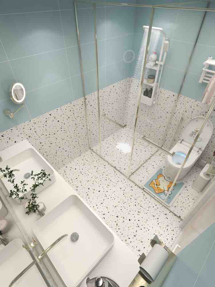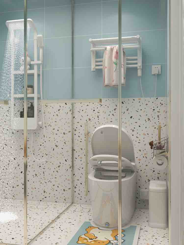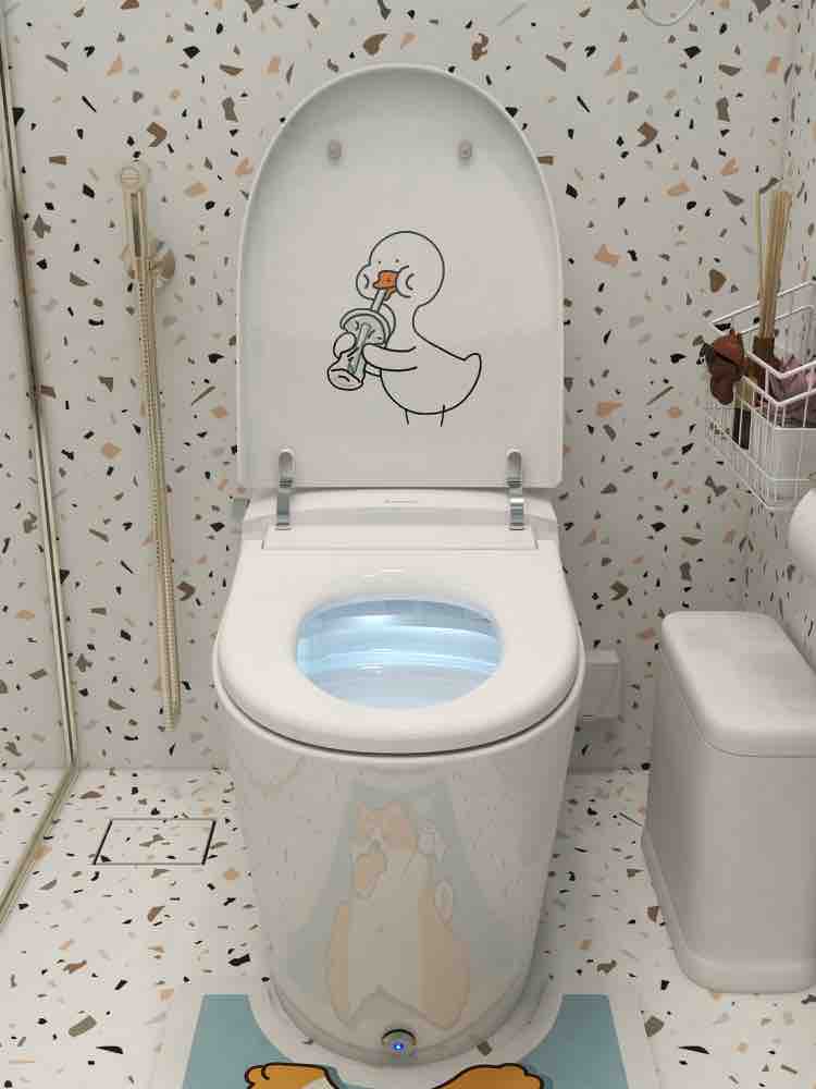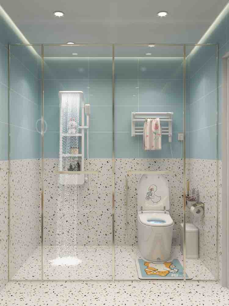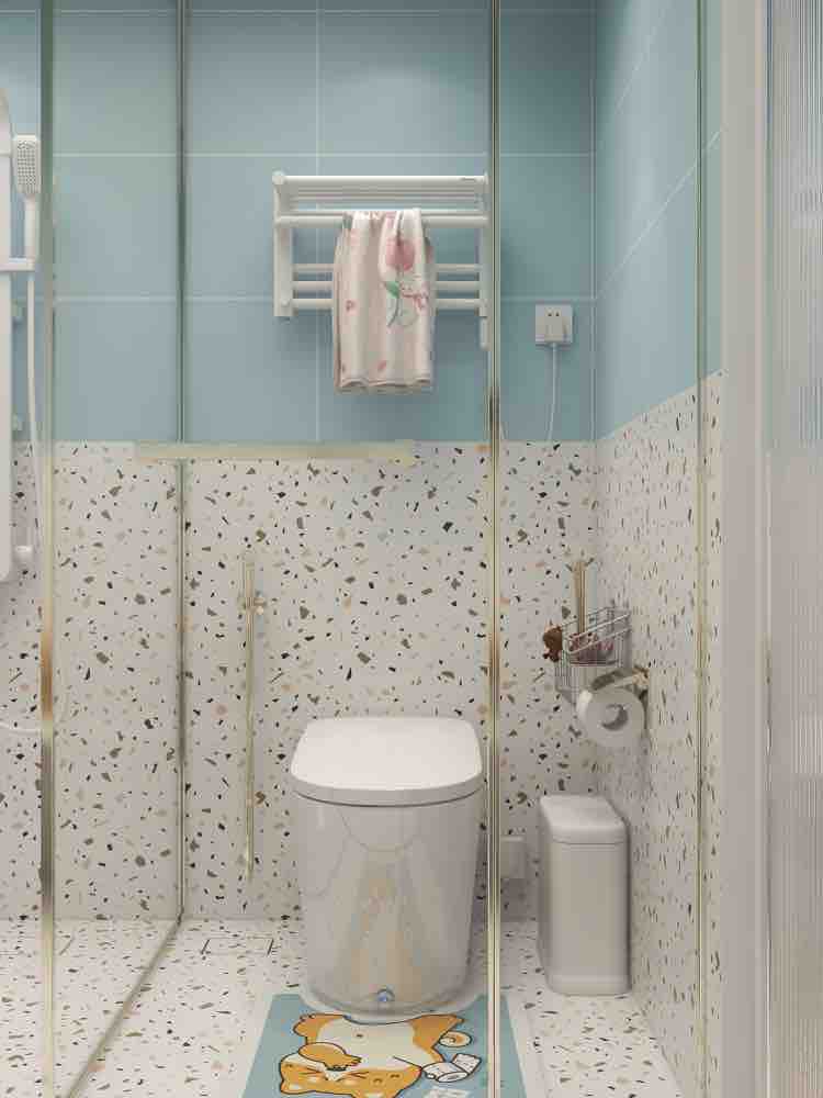 水蓝色水磨石浴室,智能马桶颜值高 基础功能: 自动翻盖,