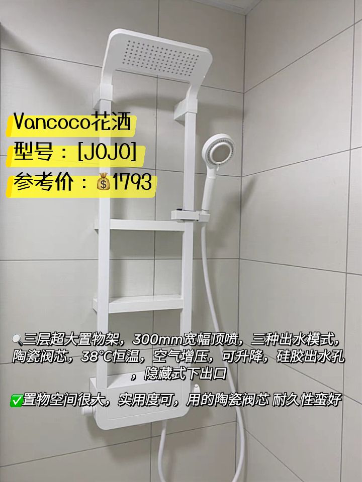 🔍三层超大置物、300mm顶喷、三种出水、陶瓷阀芯、38℃恒温、空气增压、可升降、硅胶出水孔、隐藏式下出水
