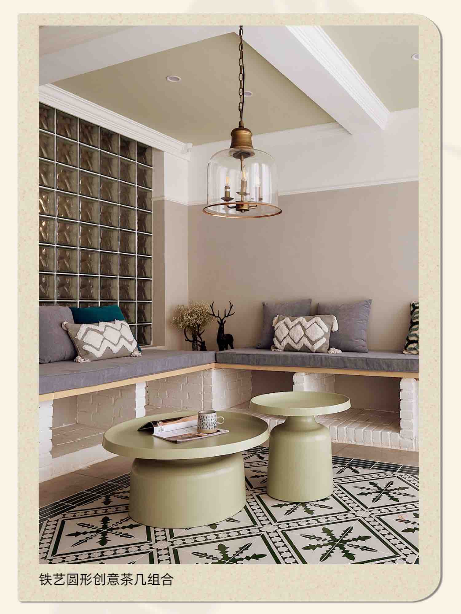 ✨ p5-6中低饱和度的绿色圆形创意茶几组合以及亮色皮质沙发椅,虽然乍一看略显跳脱,但就是这种跳脱带来独特的艺术感,并且能够减少空间的沉闷感。