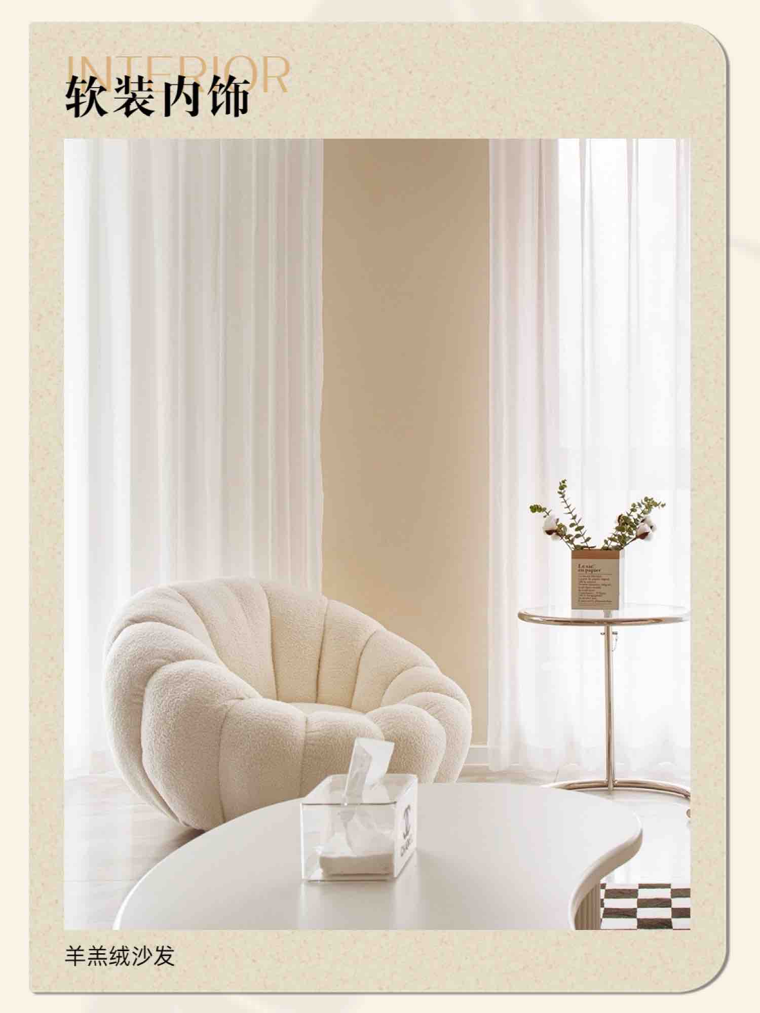 🌈p1中客厅采用奶白色不规则茶几+奶白色羊羔绒单人沙发椅+圆形玻璃小边几,每一样单品简单耐看又不失时尚品味,同时通过不同材质的碰撞,打造出温柔惬意的轻奢空间。