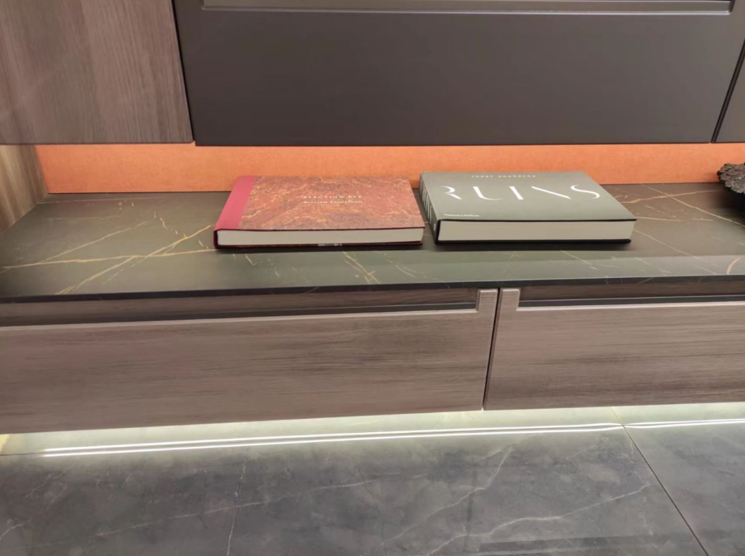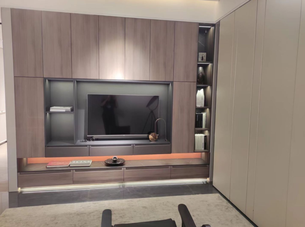 电视柜在原木色柜主体之外,还加入了银灰色的电视背景板以及哑光黑背景板的开放式格柜作为点缀,深化了电视柜的沉稳基调;再通过落地抽屉与上层柜体之间的一条爱马仕橙背景带,让整个电视柜多了一些暖意,更显家居设计的温馨感。