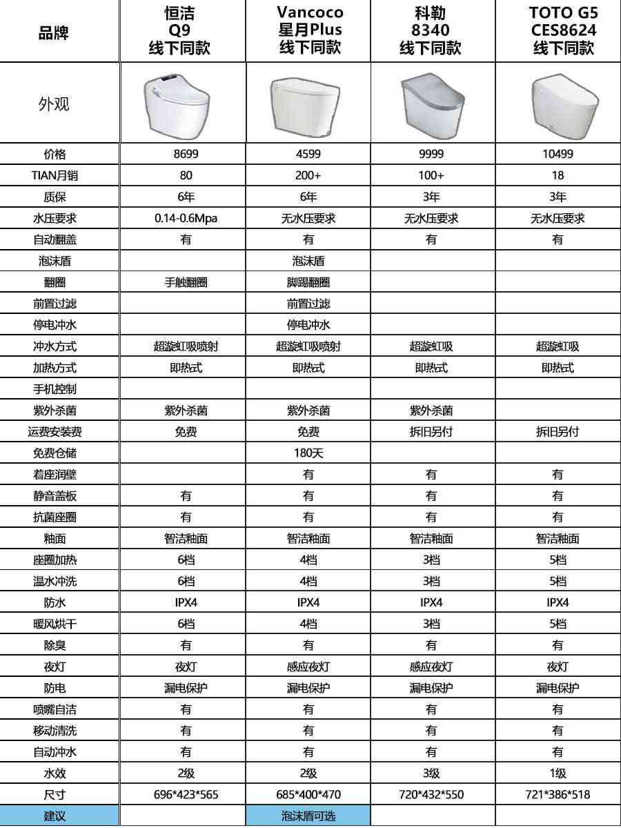 后面附有多款品牌智能马桶对比,方便大家按需选择~
