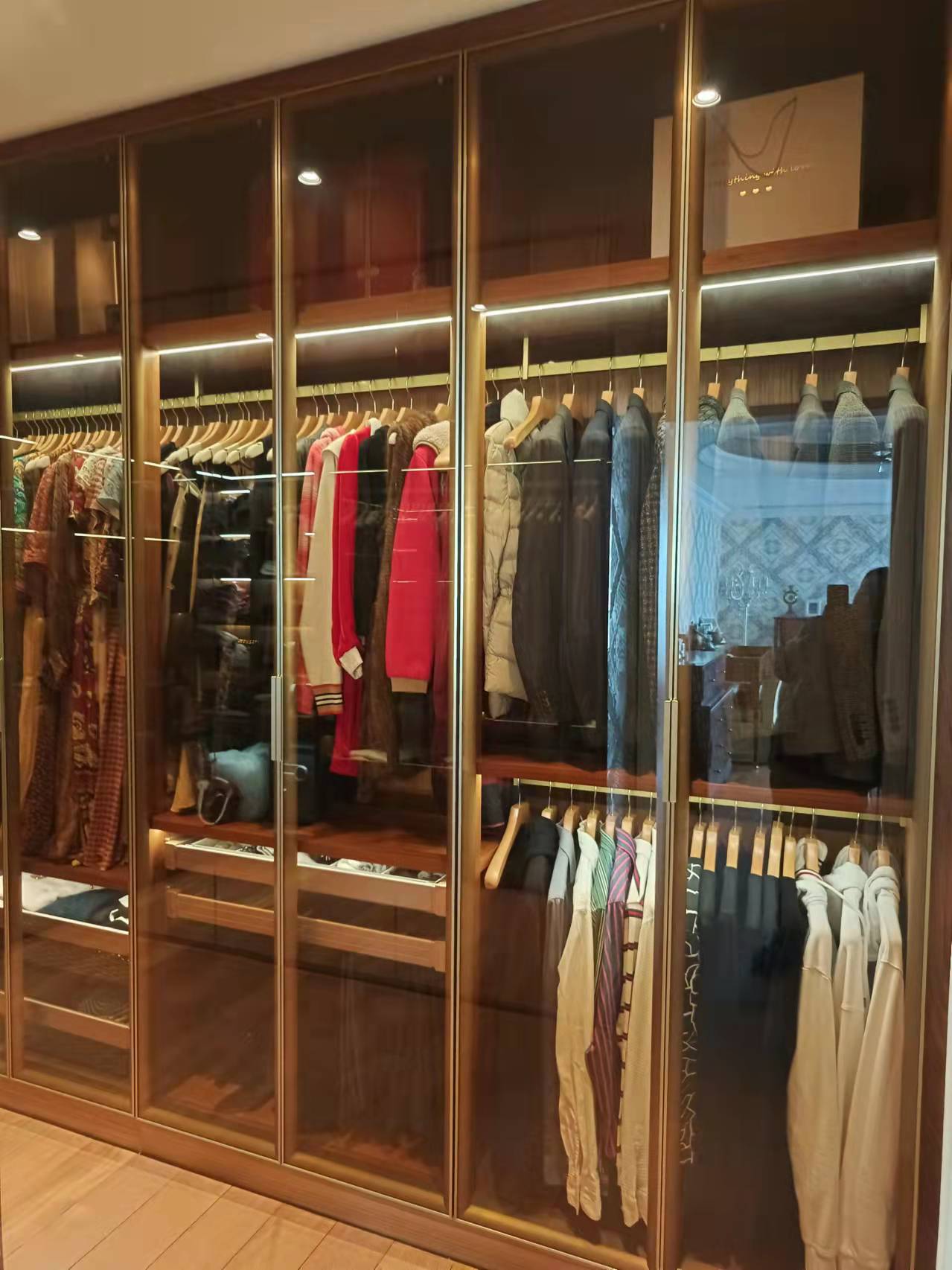 如果房子足够大,建议男女衣帽间分开。除去挂大衣外套、裙裤的部分,男士衣帽间需要增加更多不同高度的隔层和抽屉,用来放置衬衫、手表领带等。女士则要优先考虑大空间的隔层,用于收纳包包、鞋子等。