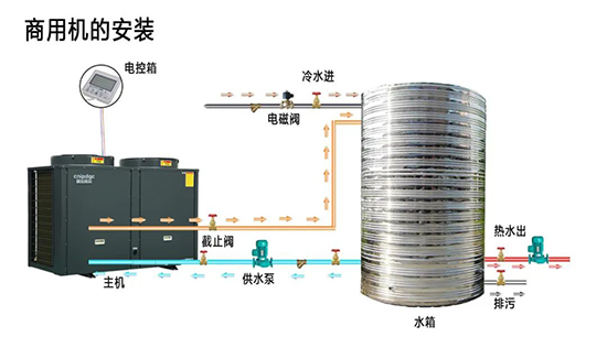 英泊索尔空气能热水工程的组成:空气能热水工程由空气能热水器、储热水箱、循环水泵、全自动控制箱、管道及配件、保温材料等部分组成。