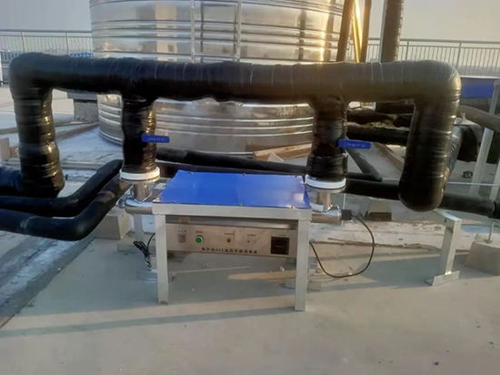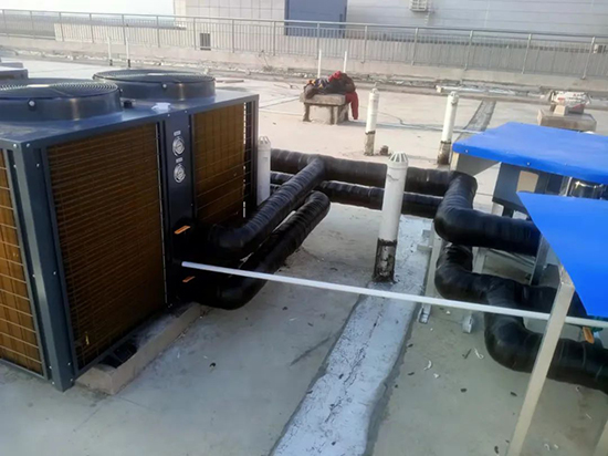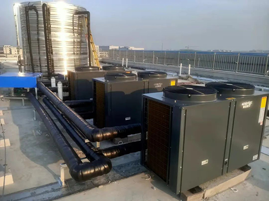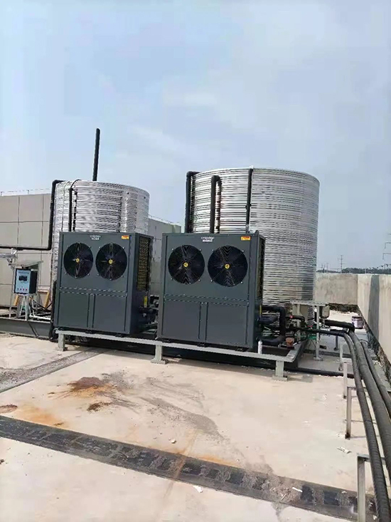 徐州沛县爱依瑞斯智能家居---员工宿舍空气能热泵热水系统太阳能和空气能结合的热水系统,该系统配备了20组太阳能工程联箱及8吨即热水箱,两台10P低温空气能热泵热水机组配15吨恒温水箱,供热水使用人数达到500人,晴天使用太阳能少量的电辅助,阴天使用空气能恒温达到最大的节能目标。该热水供应系统无需人员看管,热水管网把水箱储存的热水输送到每个用水点,打开水龙头即有温度可调,供水稳定。根据该工厂宿舍周边环境及楼面承重情况,为该工厂热水工程选择宿舍楼顶为安装场地,既不占用工厂地面面积,又保证工厂热水工程设备隔绝员工常经之地,安全节约空间。