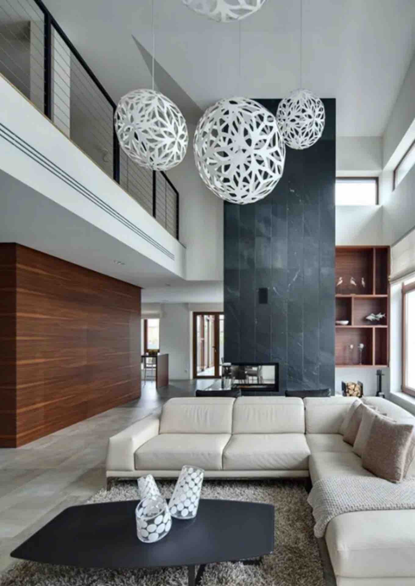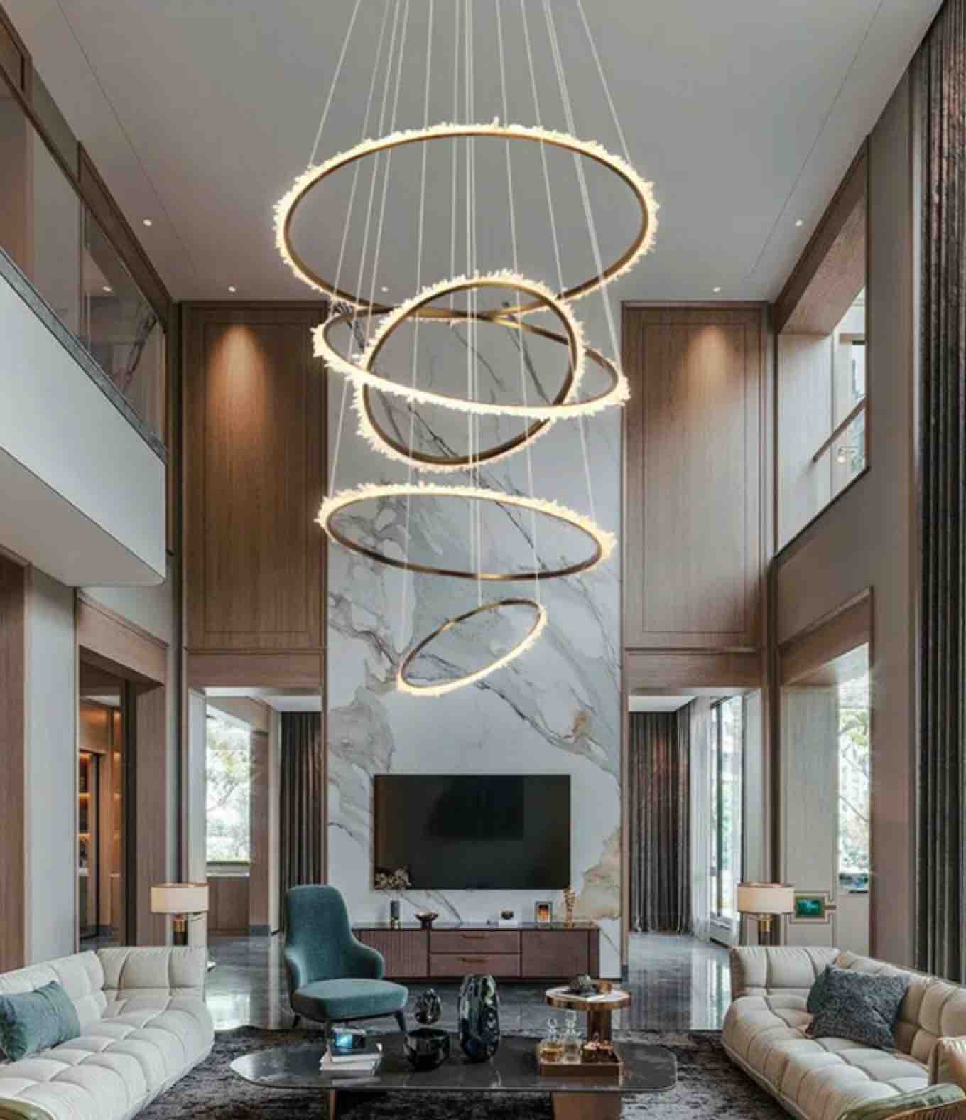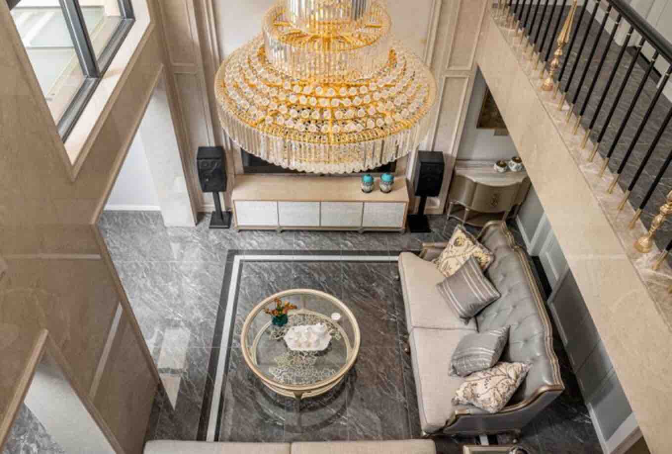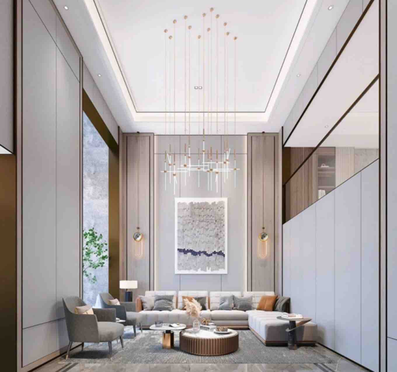 灯具的直径与亮度则需要根据客厅挑高区域的面积来确定尺寸规格,客厅面积越大所需灯具直径越大,所需的亮度越高。