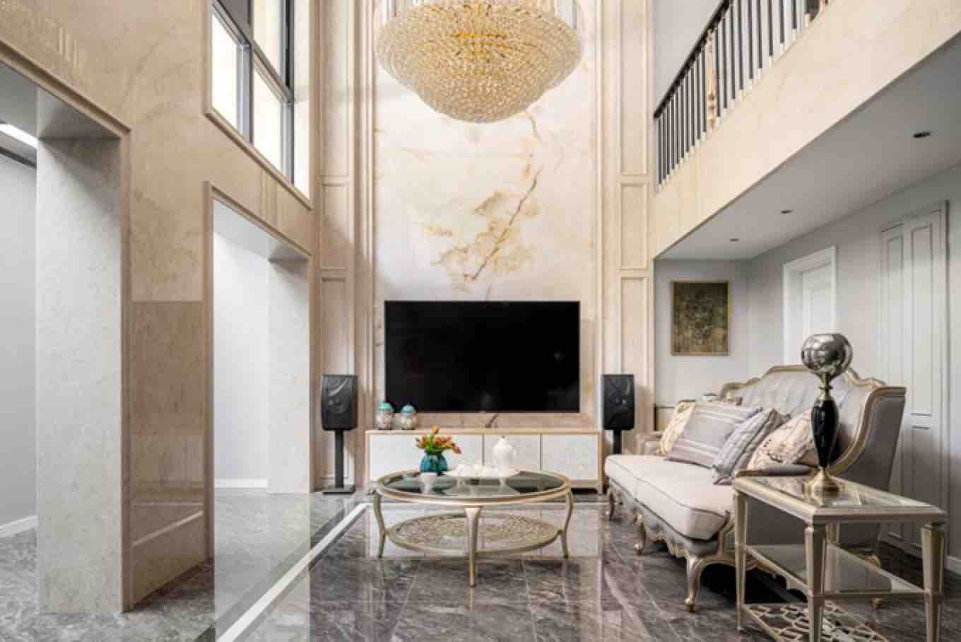 挑高的客厅层高较高,如果只用普通吊顶或筒灯射灯做照明,显然远远不能满足空间的照明需求,并且空间也会显得非常空旷,因此要选择符合空间气质的大型吊灯,才能有效避免挑空层高过高的空旷感。