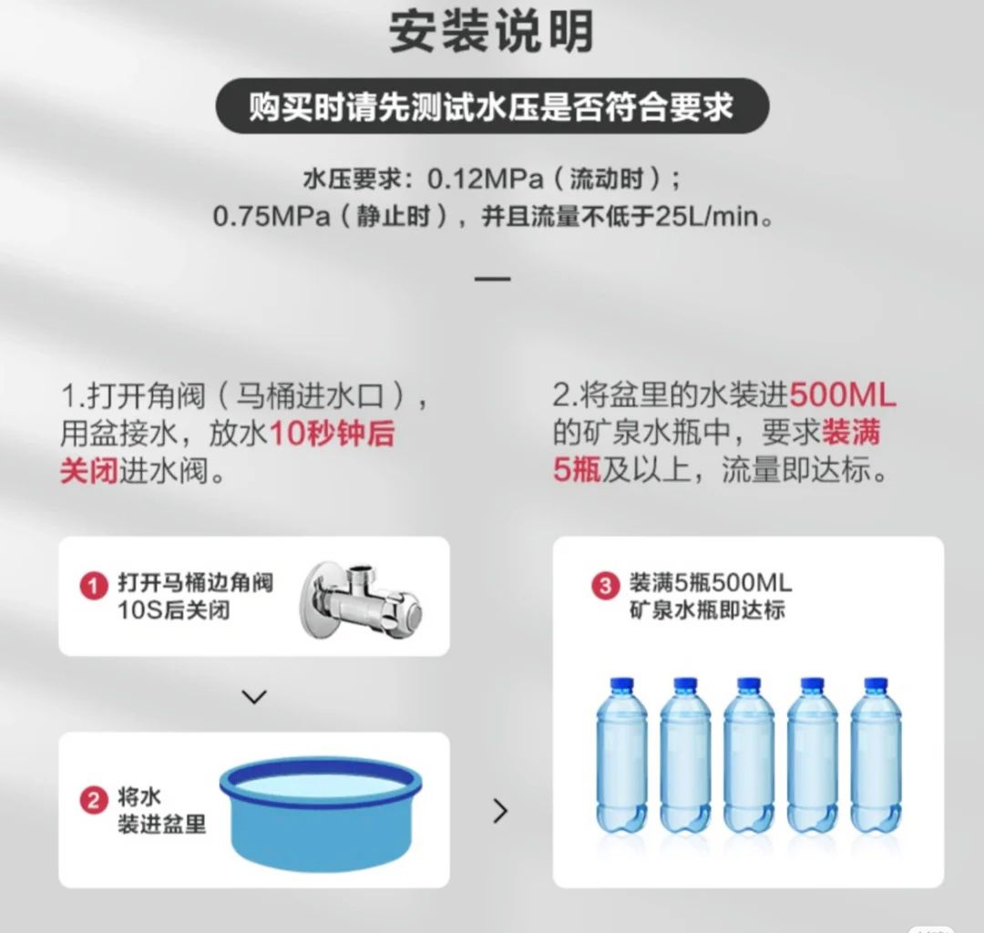 一个简易的测量方法:打开安装坐便器位置角阀,用5升可乐瓶接水,在15秒内能把水接满即可。