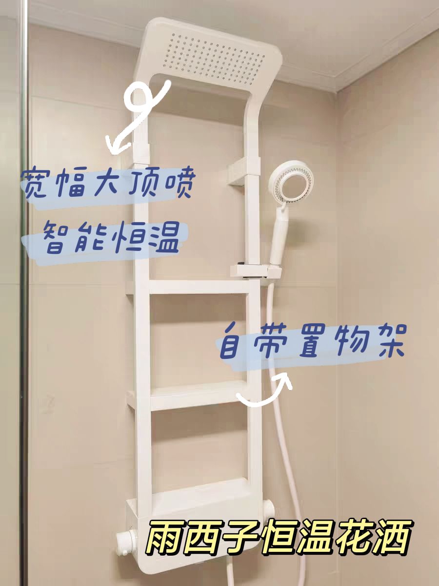 时尚简约,宽幅大顶喷,出水细腻稳定,内部还有过滤网,手持花洒可以灵活升降调整角度,喷头也很好清洁。花洒自带置物架,洗浴清洁用品都可以收纳在花洒上