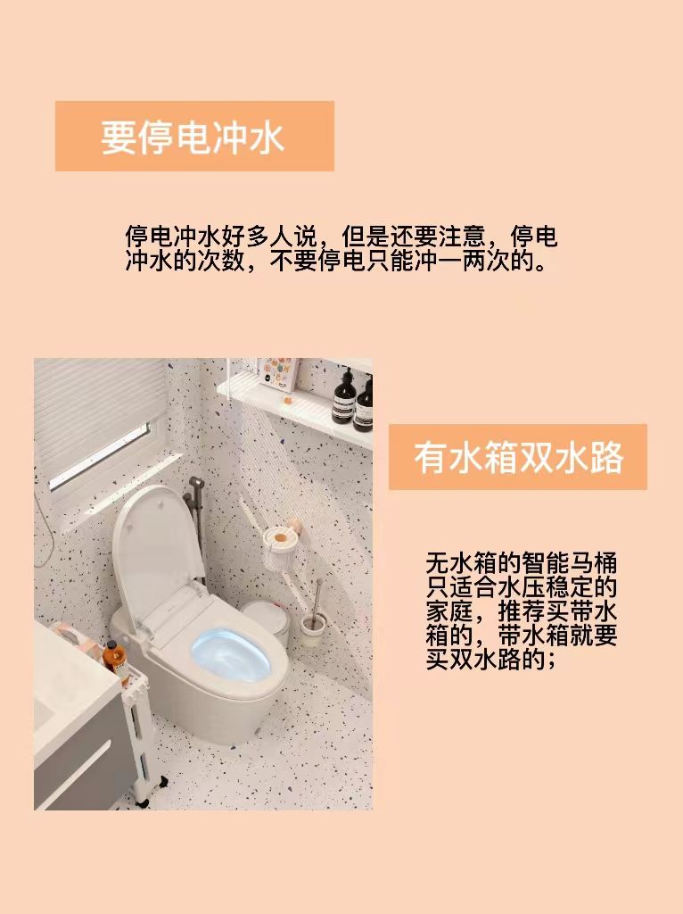 6⃣无水箱的智能马桶只适合水压稳定的家庭,推荐买带水箱的,带水箱就要买双水路的;