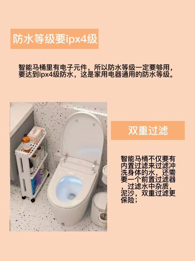 3⃣防水等级一定要够,防水等级要达到ipx4级,这是家电的通用等级,智能马桶里有电子元件,所以防水等级一定要达到;