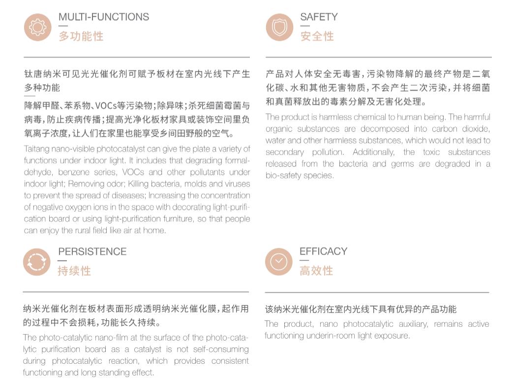 钛唐纳米可见光光催化剂可赋予板材在室内光线下产生多种功能。降解甲醛、苯系物、VOCs等污染物;除异味;杀死细菌霉菌与病毒,防止疾病传播;提高光净化板材家具或装饰空间里负氧离子浓度,让人们在家里也能享受乡间田野般的空气。