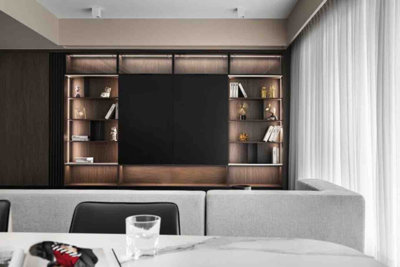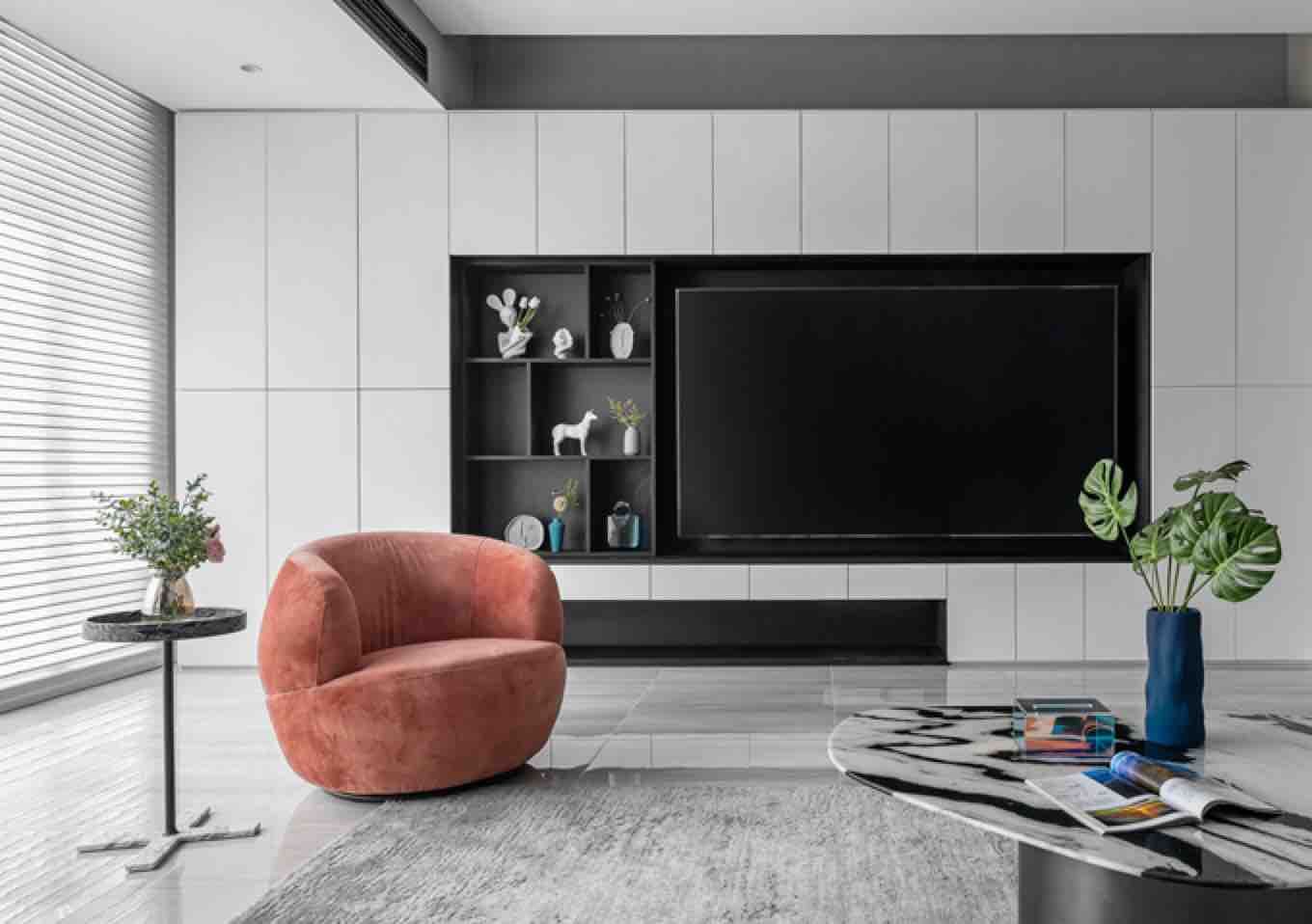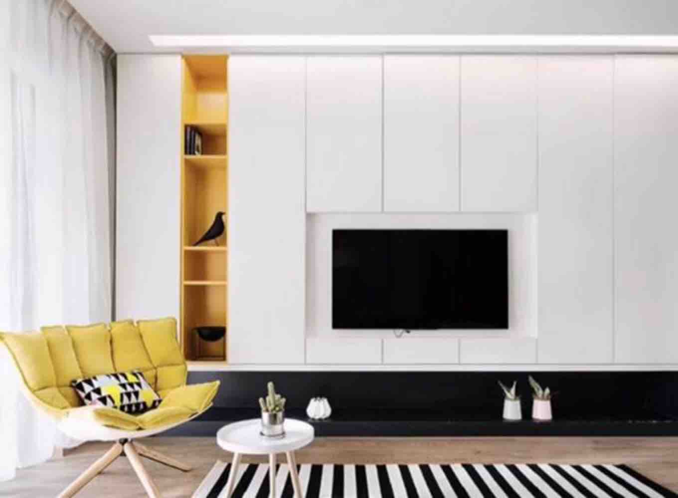 的美感和高级感,主要体现于它给人在视觉上的整体感以及统一性,想象一下电视旁洁白的柜门上是黑色凸起的门把手,是不是瞬间觉得失去了一半的美感,整体性也大打折扣。因此满墙电视背景柜无把手平板设计更合理,也能让空间布局更整齐耐看。
