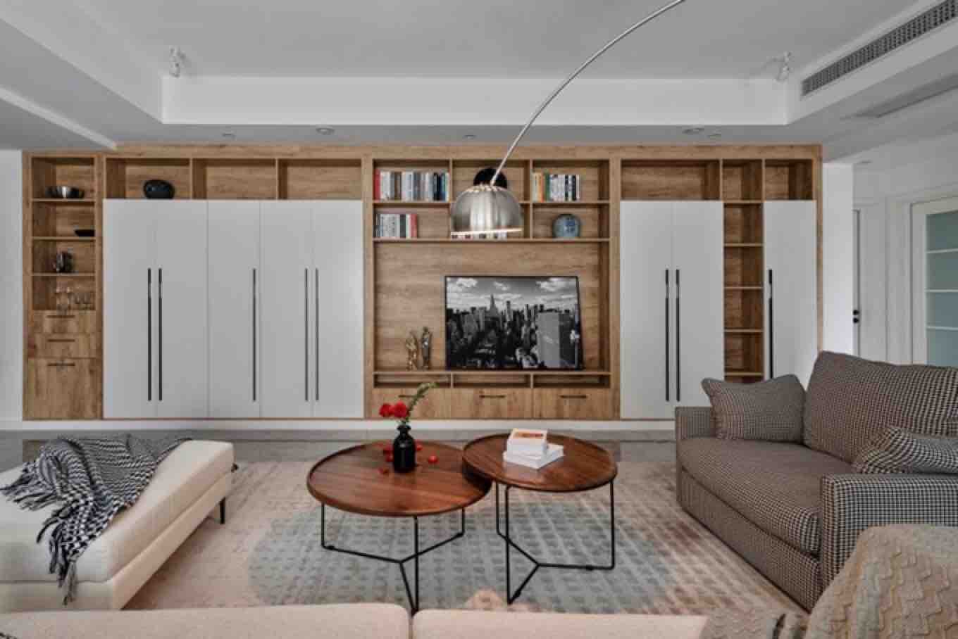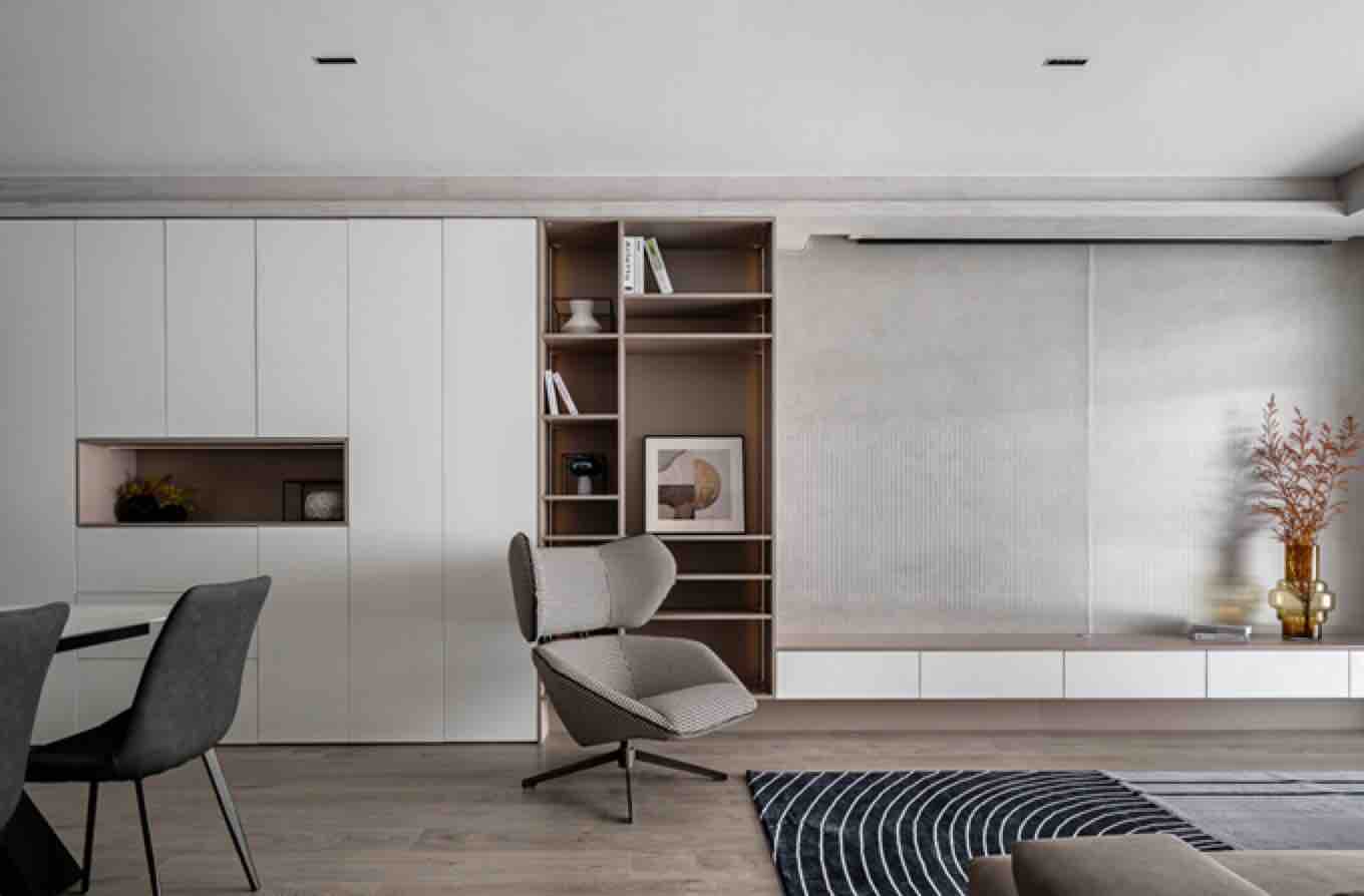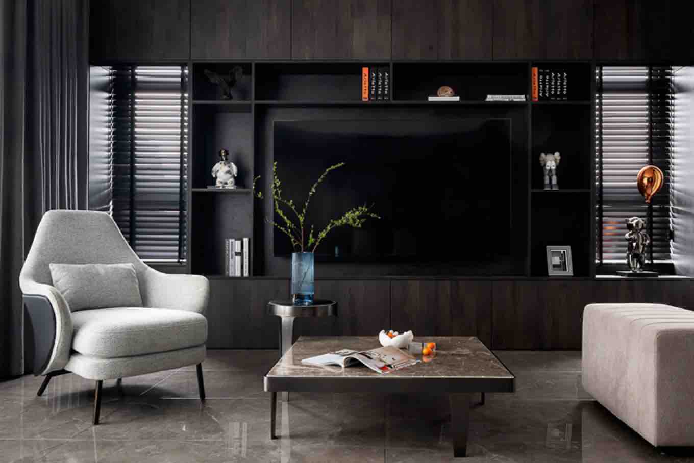 的美感和高级感,主要体现于它给人在视觉上的整体感以及统一性,想象一下电视旁洁白的柜门上是黑色凸起的门把手,是不是瞬间觉得失去了一半的美感,整体性也大打折扣。因此满墙电视背景柜无把手平板设计更合理,也能让空间布局更整齐耐看。