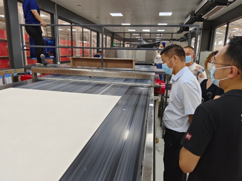 9 月12日,中兴建设有限公司领导莅临顺辉瓷砖·岩板参观考察。此次考察旨加强对顺辉瓷砖·岩板品牌生产实力、产品质量以及工程实力等方面的了解,从而进一步深入交流。NO.1参观生产基地走进绿色岩板智能生产线9 月13日上午,中兴建设有限公司考察团在讲解员的带领下近距离参观了位于高明贝斯特生产基地的绿色岩板智能生产线。考察团深入了解顺辉瓷砖·岩板产品从原料筛选到成型、喷墨印花、烧制、抛光磨边、复背网、储存等一系列生产流程,从视觉、触感、切割细节等多个方位考察顺辉产品的综合实力。